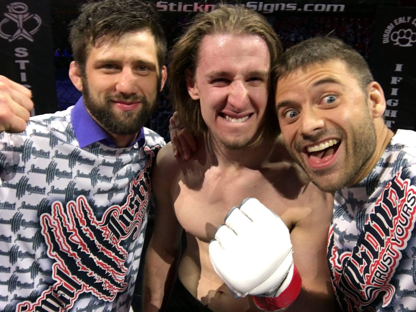 This is all from memory so I may have some of the details off. Mike came out with a vicious leg kick and his opponent kept his distance. Mike threw a few more kicks until they closed the distance. Mike took his back on top and punching. He was losing the back a little and transitioned into a triangle. He took a few shots while locking it up but kept from getting picked up or slammed. Close to the end if the round he turned it into an armbar that was super tight and got the tap. Our section exploded and I could relax again. Mike had won his first fight!